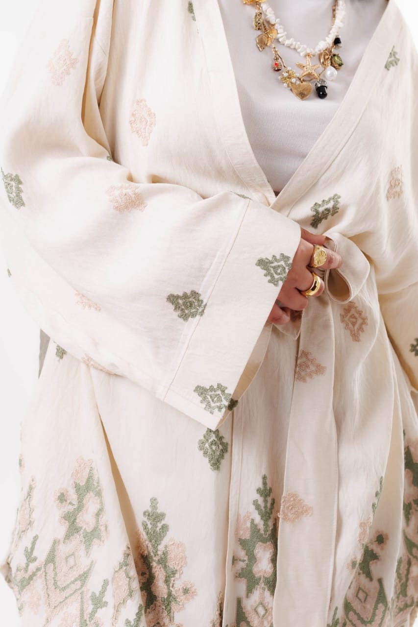 Soft set with a comfy adjustable wide pants cut, with puffy sleeves. Embroidery at its finest on the edges.