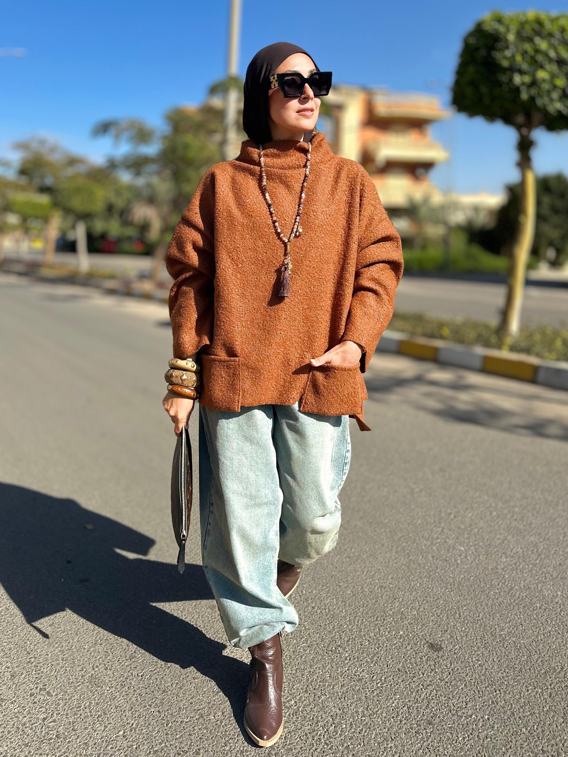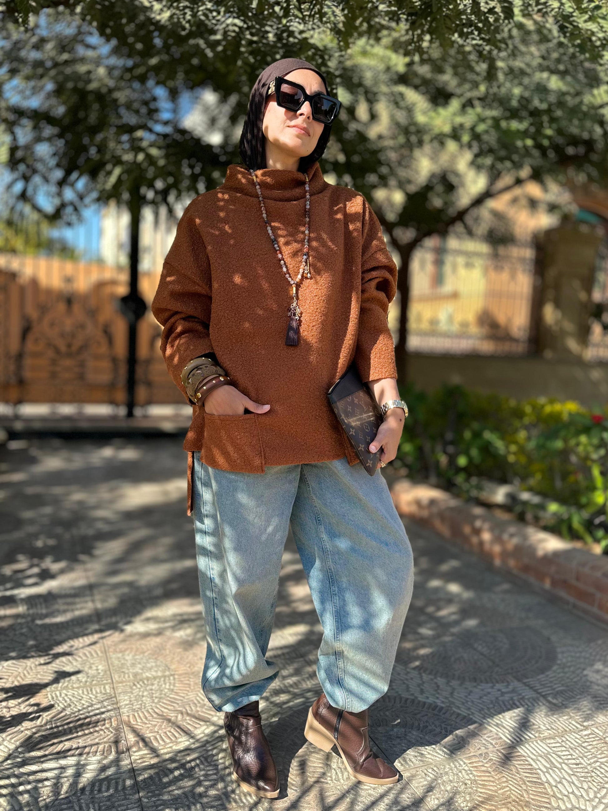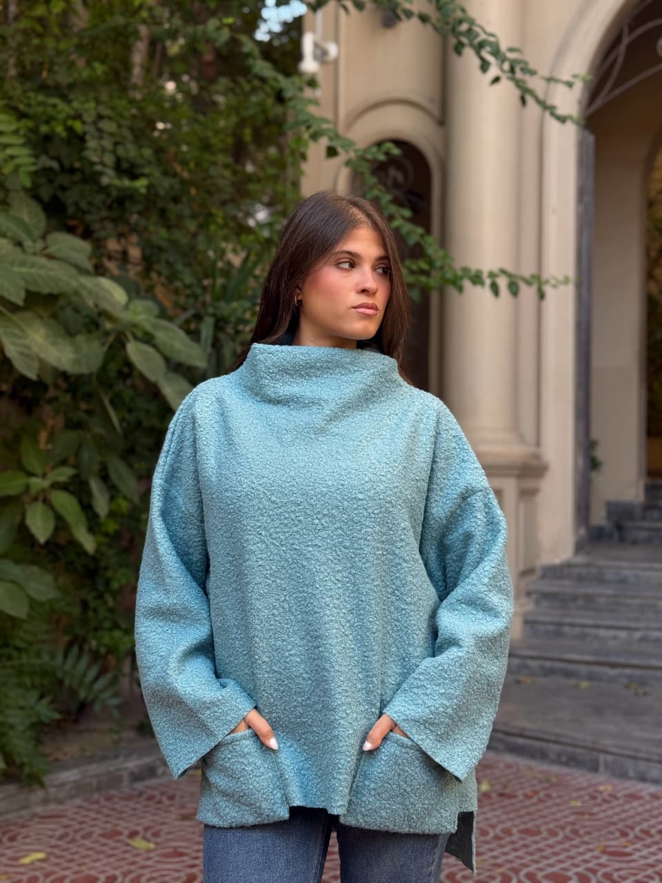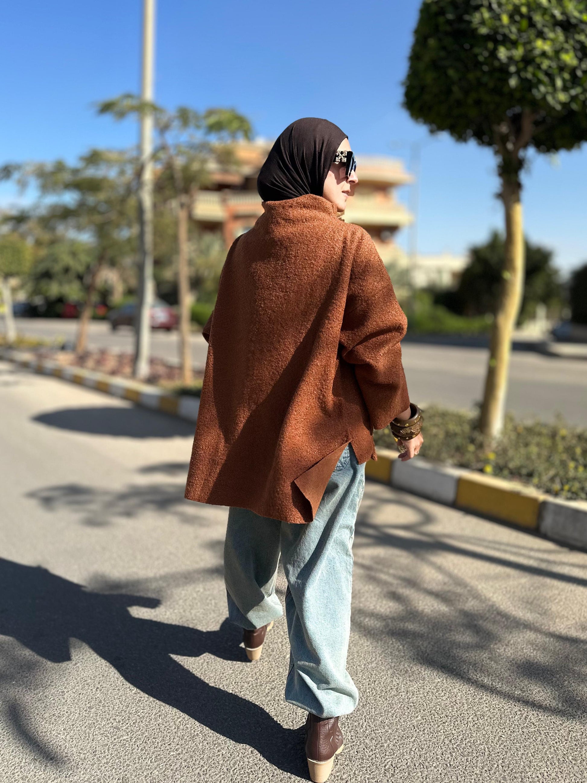Crafted from a soft, textured fabric with a rich, cozy feel, with relaxed oversized silhouette, wide sleeves, and a structured high neckline for modern elegance.