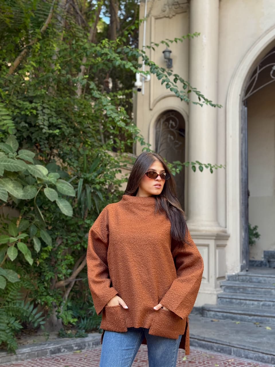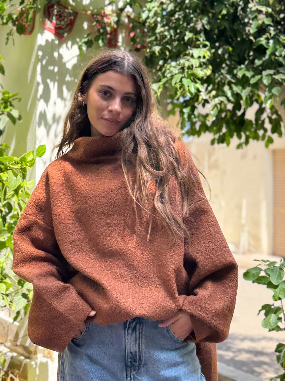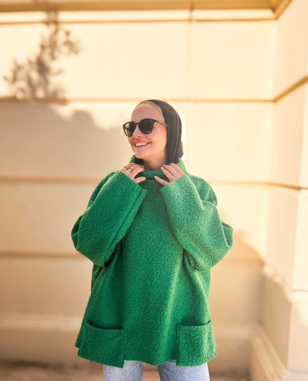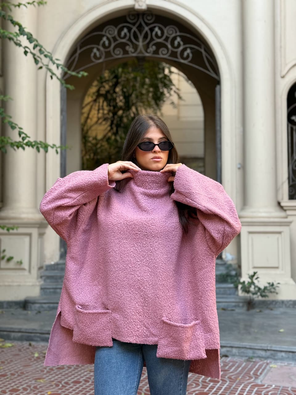 Crafted from a soft, textured fabric with a rich, cozy feel, with relaxed oversized silhouette, wide sleeves, and a structured high neckline for modern elegance.