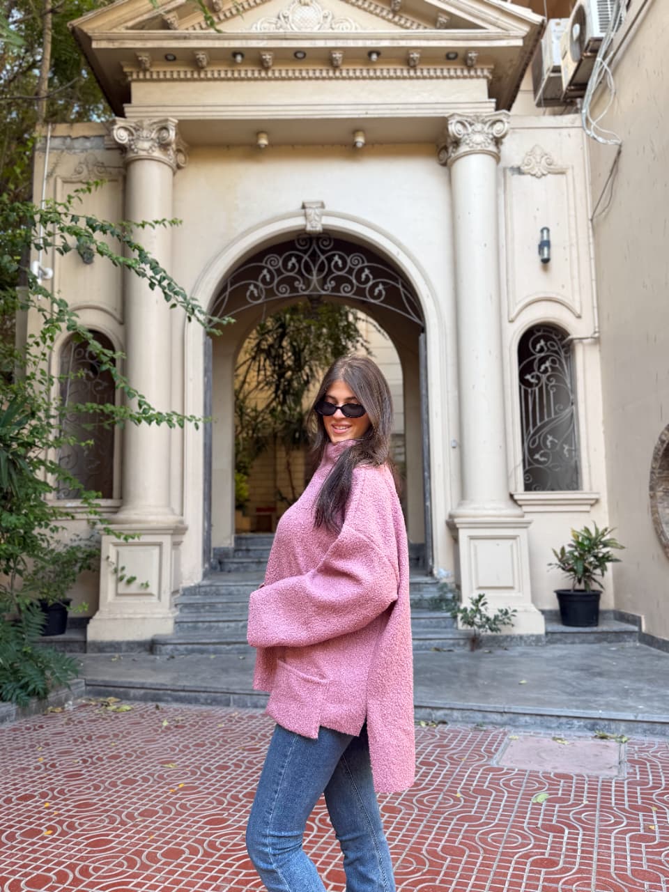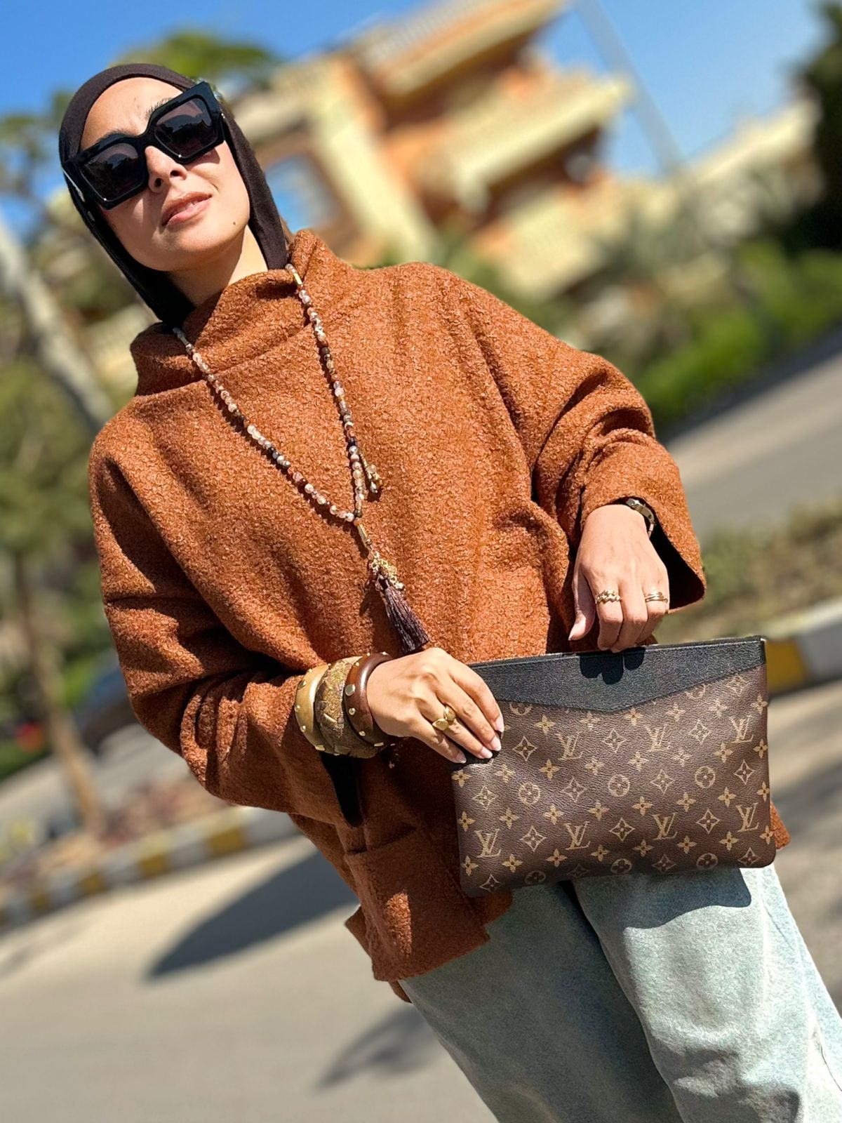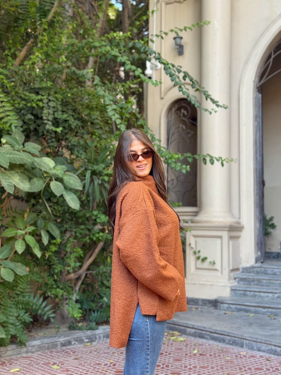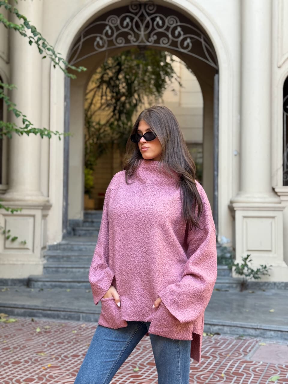 Crafted from a soft, textured fabric with a rich, cozy feel, with relaxed oversized silhouette, wide sleeves, and a structured high neckline for modern elegance.