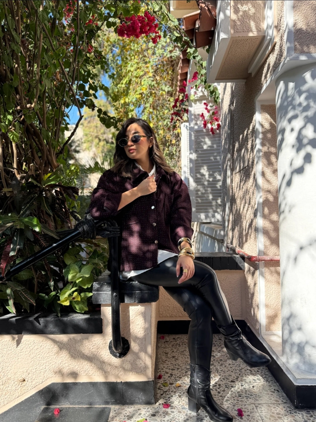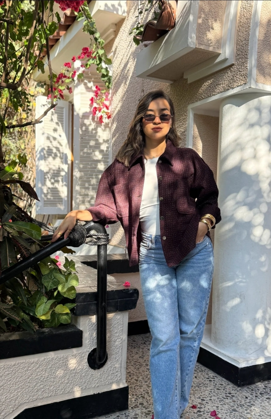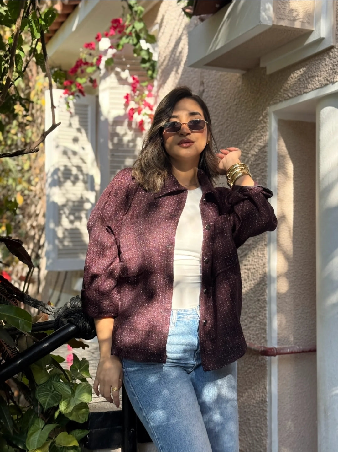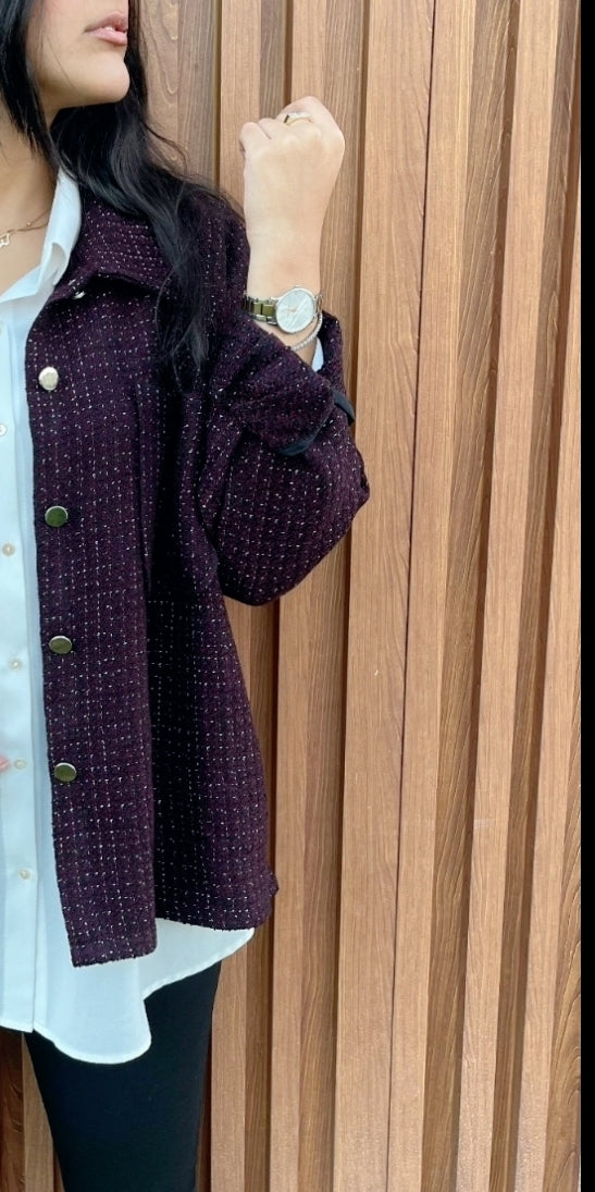 Textured jacket with statement buttons for an elevated everyday look. Styling versatile and body flattering.